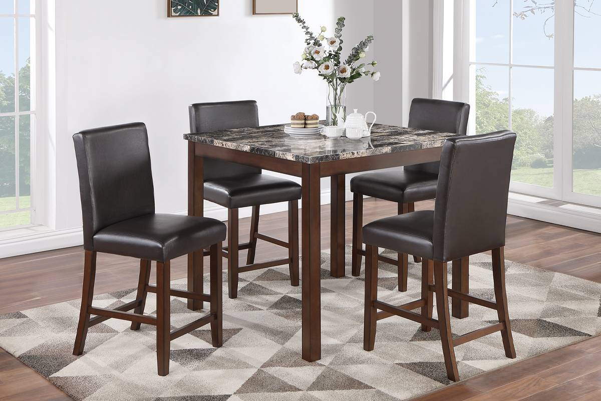 Ensemble de table à manger carrée Poundex F2615, 5 pièces, en bois finition marron avec plateau en imitation marbre. Cet ensemble comprend la table et quatre chaises d'appoint rembourrées. Dimensions de la table : 122 x 122 x 101 cm (40 pi x 40 pi x 36 pi) et des chaises d'appoint : 4,5 x 6,4 x 101 cm (18 pi x 21 pi x 40 pi).