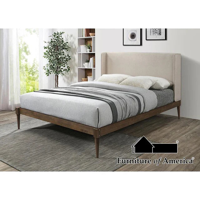 Le lit plateforme présente un style Mid-Century Modern avec une finition noyer riche, une tête de lit en tissu beige rembourré pour plus de confort et des pieds extra-hauts offrant un espace de rangement supplémentaire sous le lit. Aucun sommier requis.